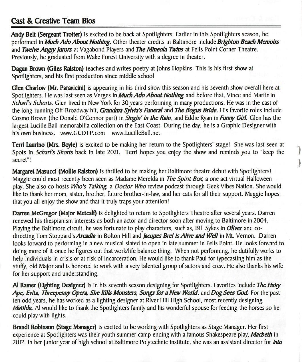 "Rounding out those now in residence at Monkswell Manor include [. . .] and the unusual Mr. Paravicini (Glen Charlow.) [. . .] Glen Charlow as Mr. Paravicini is the quintessential cuckoo who appears to arrive merely to stir up chaos. Charlow's accent-- intentionally vague and meandering-- adds to the enigmatic nature of his character. The way he wiggles his (very obviously) false mustache, the way he affects his mannerisms to be just on the edge of unusual but perhaps merely foreign, all add to the delight of watching him on stage". ~Amanda N. Gunther (TheatreBloom) FULL REVIEW |